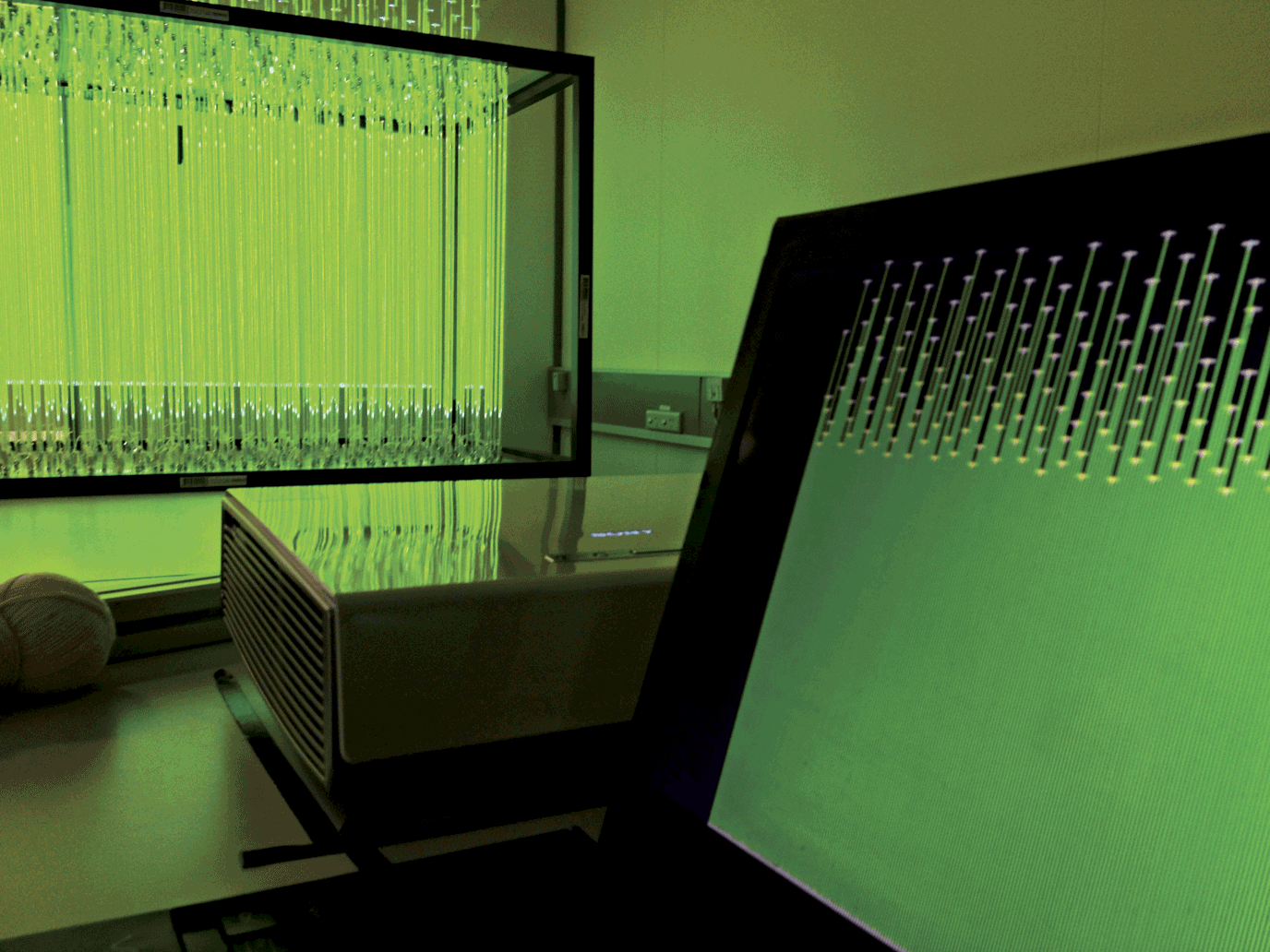 Challenged with visualising an environment context in a museum it, the Stellr’Lumara installation as a volumetric display for seeing 3D images and motion was ideal. Consisting of a frame with rows of strings placed in a grid formation, the custom software created an image in a series of vertical strips, a few pixals wide with each strip corresponding to a single string on the Stellr’Lumarca. The strings precisely aligned to the projector to create the 3D images and motion.